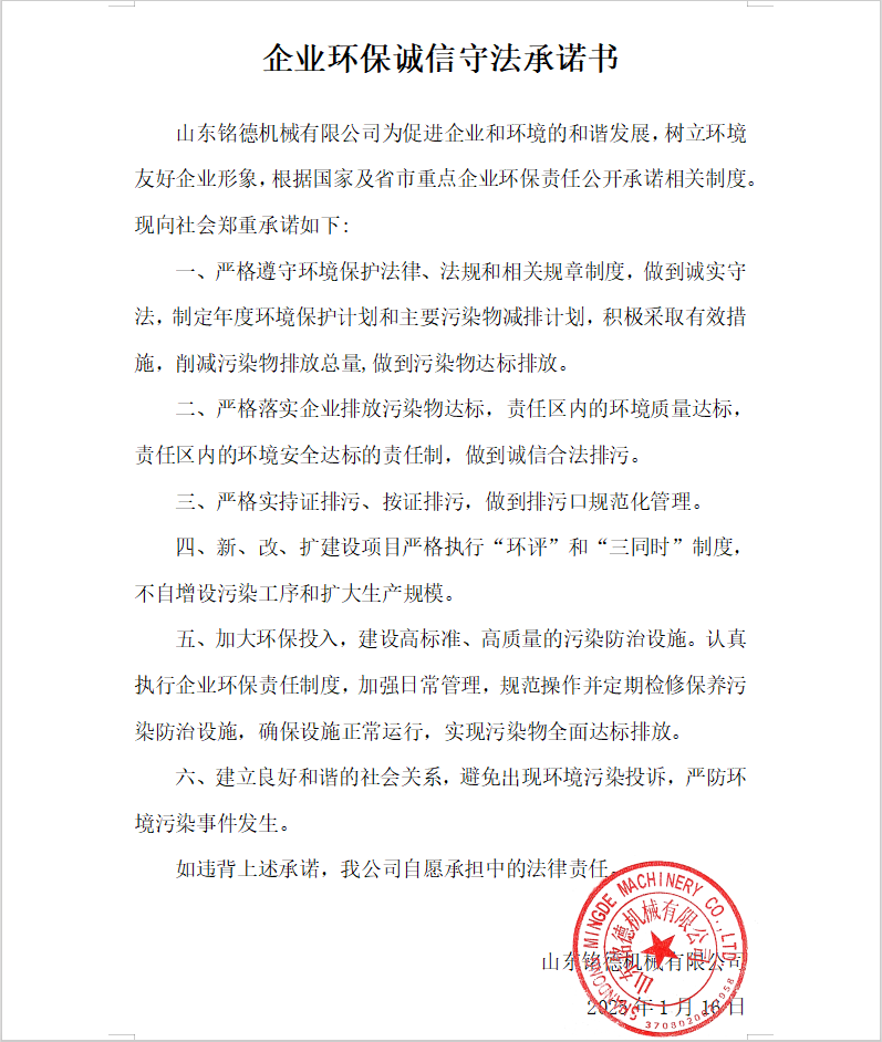 山東銘德機械有限公司為促進企業(yè)和環(huán)境的和諧發(fā)展,樹立環(huán)境友好企業(yè)形象,根據(jù)國家及省市重點企業(yè)環(huán)保責(zé)任公開承諾相關(guān)制度?,F(xiàn)向社會鄭重承諾如下: